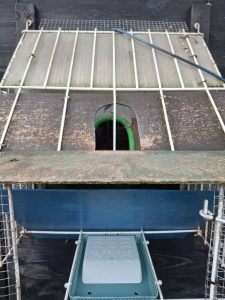 Petit aménagement fonctionnel de protection de nos antennes maintenant toutes disposées complètement sous les planches d’envol de nos spoutniks avec trappe d’accès unique pour les réceptions enregistrées à l’arrivée de nos pigeons sur les plus prochains concours colombophiles.