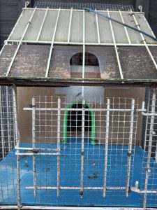 – Au passage, outre le grillage à mailles réduites disposé sur tout le pourtour, remarquez aussi ce sandow sur le dessus du Spoutnik : il sécurise l’entrée du colombier lorsque la planchette de réception est fermée, de façon à ne permettre aucune entrée d’éventuels prédateurs (Fouine, Rat, Genette, etc…).