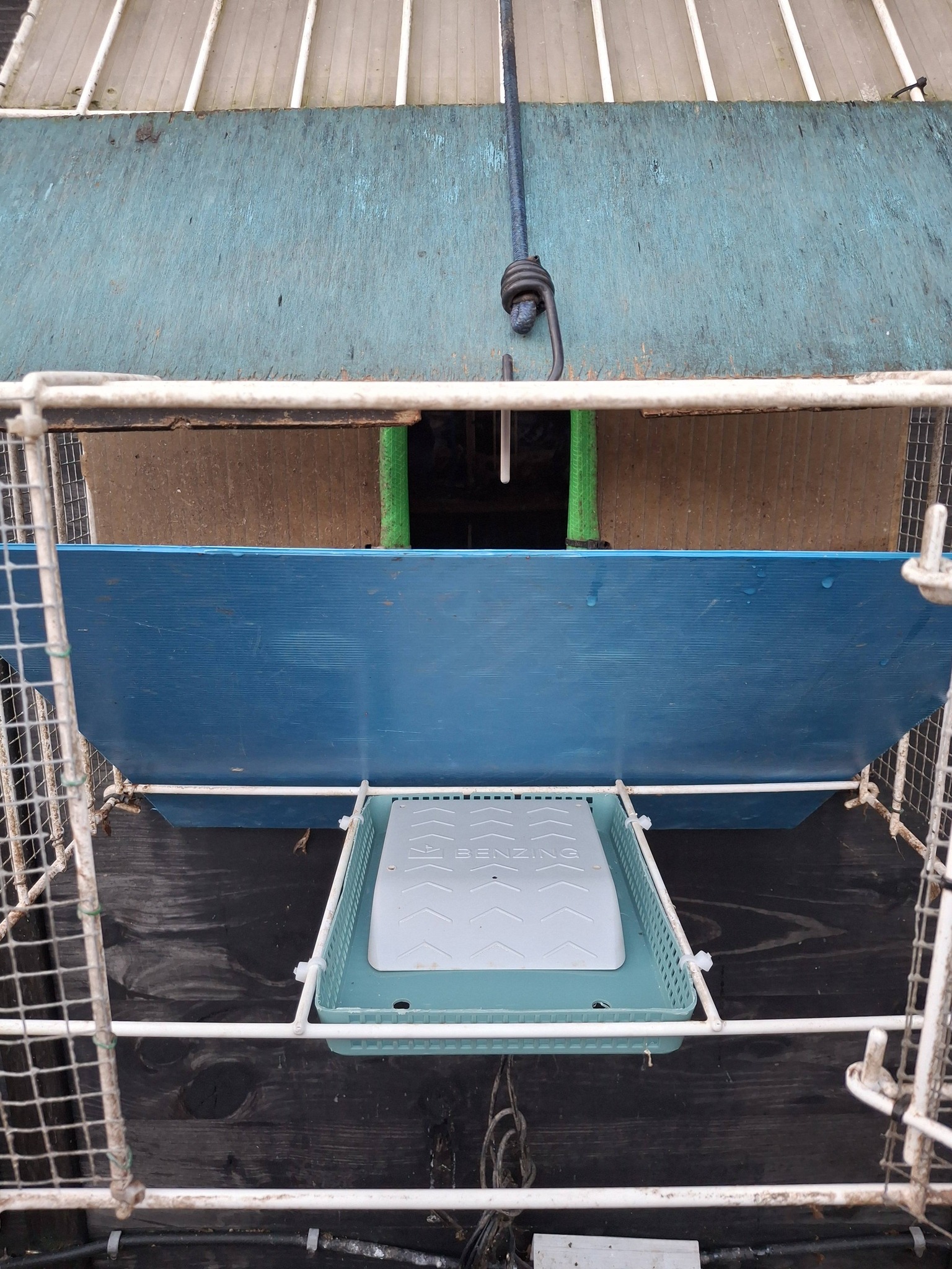 – Au passage, outre le grillage à mailles réduites disposé sur tout le pourtour, remarquez aussi ce sandow sur le dessus du Spoutnik : il sécurise l’entrée du colombier lorsque la planchette de réception est fermée, de façon à ne permettre aucune entrée d’éventuels prédateurs (Fouine, Rat, Genette, etc…).